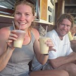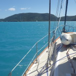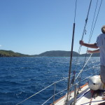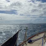 As we zoomed south, the winds clocked around and soon we were on a close reach, powering upwind. The boat was heeled over about 30 degrees for days and we buried the starboard toe rail. We did have one day of no wind when we turn on the engine, but we made the passage burning only about 10 gallons of fuel. We had so much wind that it wasn’t possible for Stella to sail any faster. With that much wind you get a lot of “active sailing” – hand steering, trimming sails, and a few days of not feeling 100%. By Tuesday our bodies (and minds) we all starting to show some signs of exhaustion. Finally Wednesday morning we shouted LAND HO and made our way to a mooring ball here at the Bitter End Yacht Club on Virgin Gorda and before we knew it we were sipping painkillers at the Crawl Pub with our friends Baxter and Molly on Terrapin.