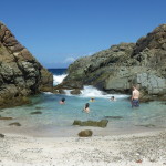 We decided to get our passports stamped the next morning, so we sailed over to Jost Van Dyke in hopes of finding a TV to watch the Superbowl. We were all underwhelmed with Great Harbour AND with the outcome of the game, so we dropped the ball again the next morning and headed off to Green Cay to hike to the Bubbly Pool (we have decided not to skip any attractions just because they are “touristy”). The Bubbly Pool is this little protected pool behind giant boulders. When big waves hit the rocks, the pool fills with tiny bubbles like a hot tub! Very very cool stuff. When we got back to the boat, we decided that this spot was too bouncy to spend the night so we changed plans and sailed over to Cane Garden Bay on Tortola for the night. This turned out to be our favorite spot of the trip with a long white beach AND room to anchor.