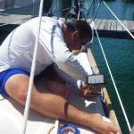 Next Logan taped off the deck and rub rail with one inch 3M masking tape to protect the fiberglass and stainless steel. It was time to sand. He used 80 grit sandpaper to remove any left over varnish and smooth out the bumps. Then he sanded again with 120 grit sandpaper to really buff the surface. We were beginning to get dizzy from all this going around the rails like this!