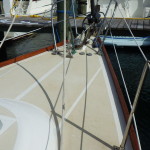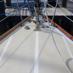 Before we applied any oil, we wiped down the rails with mineral spirits and painted on a coat of teak brightener. Are you counting…this makes five passes around the rails. Finally it was time to oil. We had a tough time deciding between finishing the wood with oil or varnish. There are pros and cons to each treatment, but in the end we decided the oil would leave more options with less of a commitment if a decision was made in the future to use varnish or leave the teak untreated. So we oiled. Four times. Two penetrating coats, one coat wet sanded in with 400 grit sandpaper and one more penetrating coat.